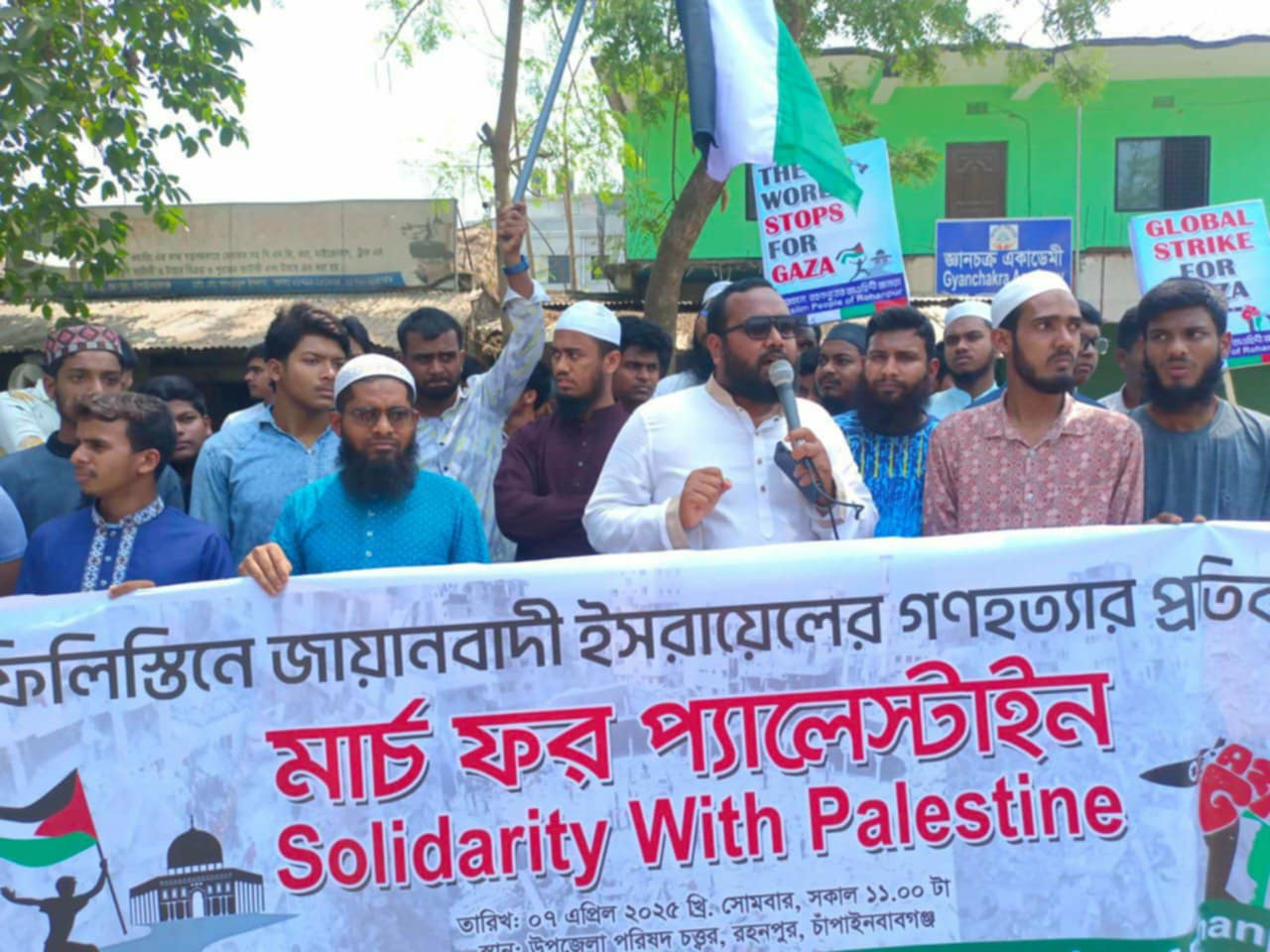 ফিলিস্তিনে চলমান ভয়াবহ হামলার প্রতিবাদে চাঁপাইনবাবগঞ্জের গোমস্তাপুর উপজেলার রহনপুরে ছাত্রসমাজের উদ্যোগে এক বিশাল বিক্ষোভ মিছিল ও প্রতিবাদ সমাবেশ অনুষ্ঠিত হয়েছে। ৭-এপ্রিল (সোমবার) সকাল ১১:৩০ মিনিটে গোমস্তাপুর উপজেলা চত্বর থেকে শুরু হওয়া বিক্ষোভ মিছিলটি শহর প্রদক্ষিণ করে কলোনি মোড়ে পথসভার কর্মসুচি শেষ হয় I